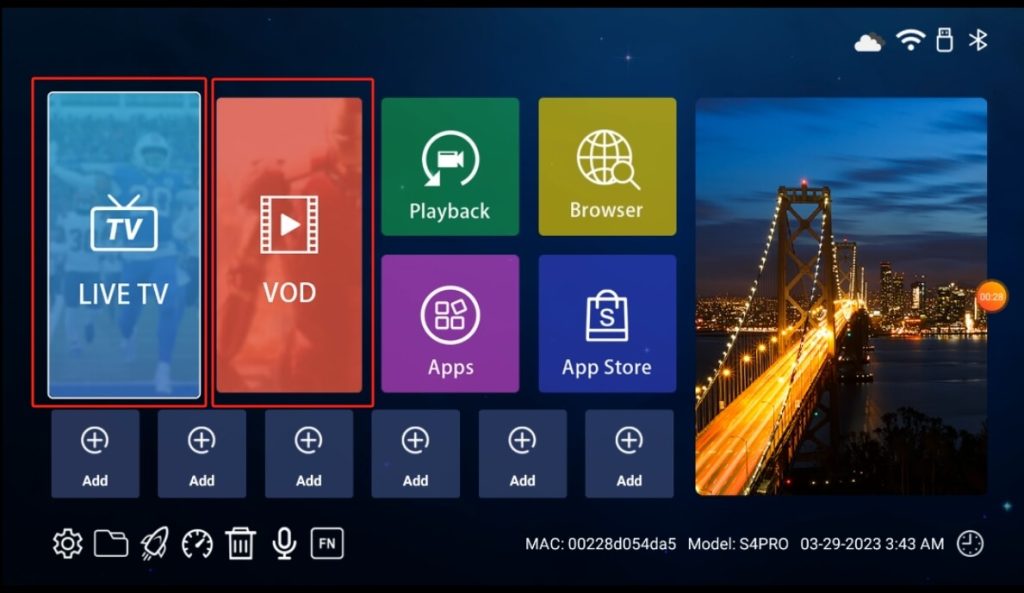 - Or Click the LIVE TV and VOD blocks to put apps at here